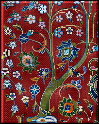 | The Prayer Rug Design (detail) A classic Janamaz or Prayer Rug with the highly stylized Trees of Life and the flowering urn hanging in the mihrab. A favourite of the Sultans of Turkey the design embodies all the devotional symbols of Islamic cosmology. Earliest specimens of this style are to be found in the Topkapi Museum, Istanbul. Size: 5'.11" x 4'. 1" (approx:) | No. 109